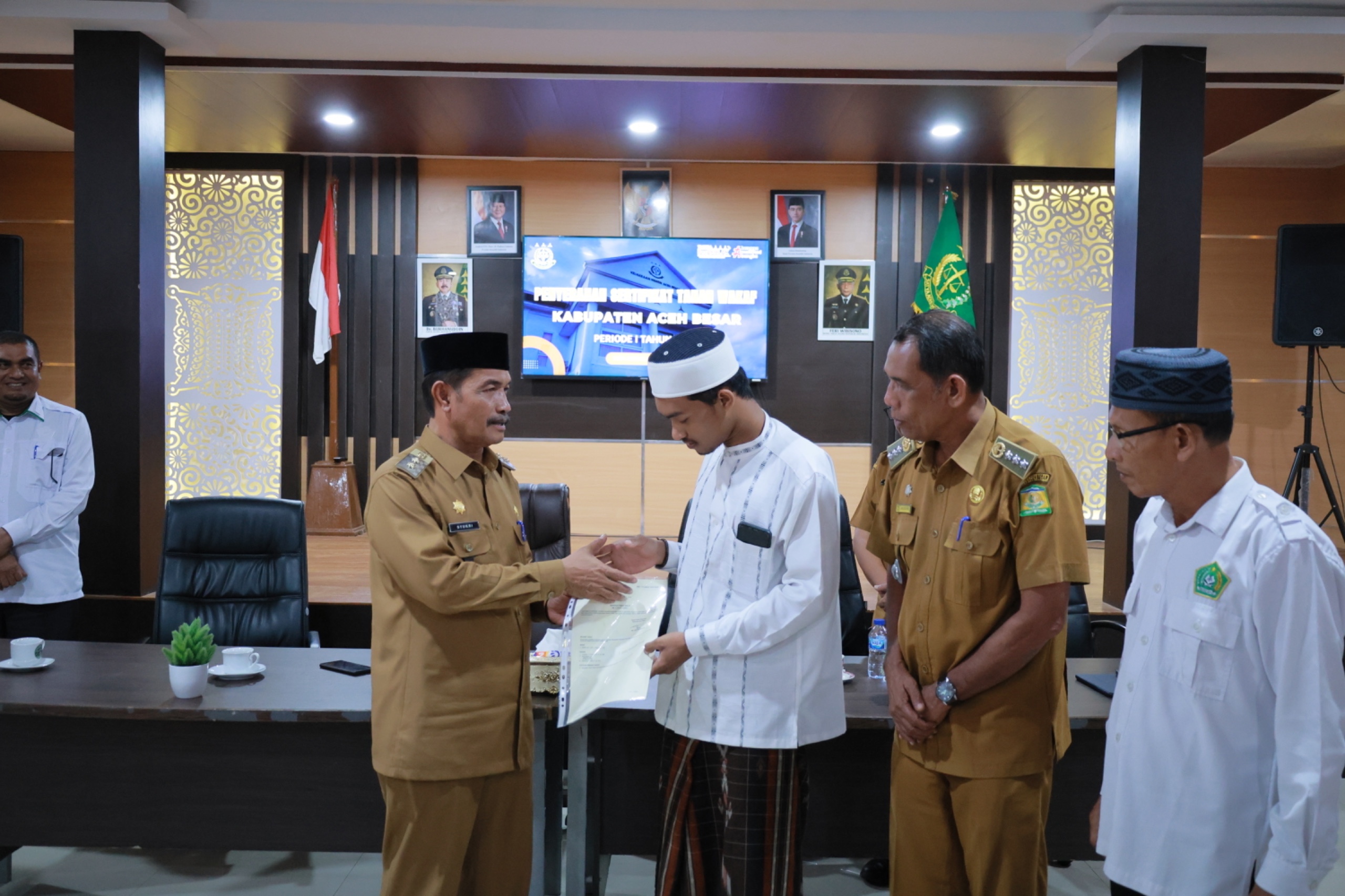 Wakil Bupati Aceh Besar Drs Syukri menyerahkan sertifikat tanah wakaf periode pertama di Aula Kejaksaan Negeri di Kota Jantho, Selasa (15/04/2025).