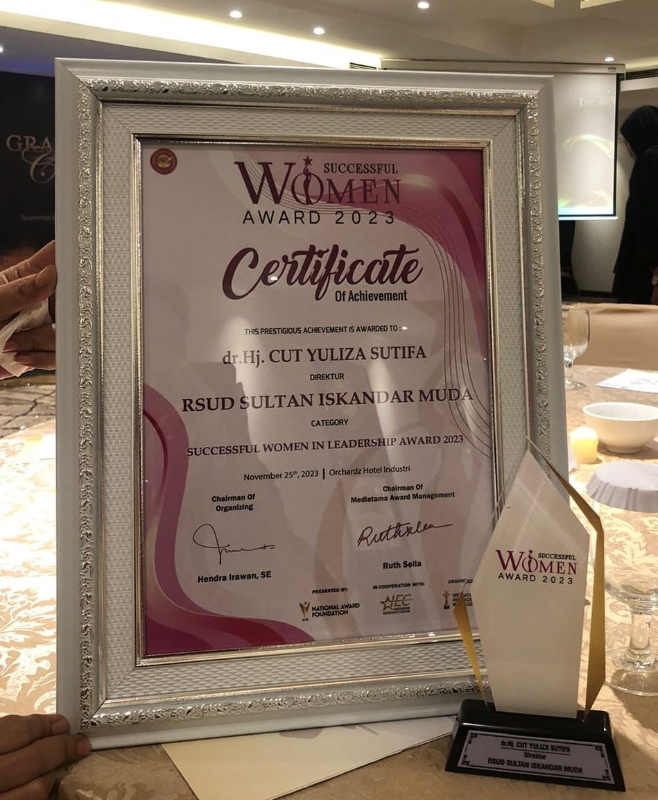 Acehpost.id | Nagan Raya – Direktur Rumah Sakit Umum Daerah Sultan Iskandar Muda (RSUD SIM) Kabupaten Nagan Raya, dr Hj Cut Yuliza Sutifa, terima penghargaan Successful Women in Leadership Award 2023 dari National Award Foundation.