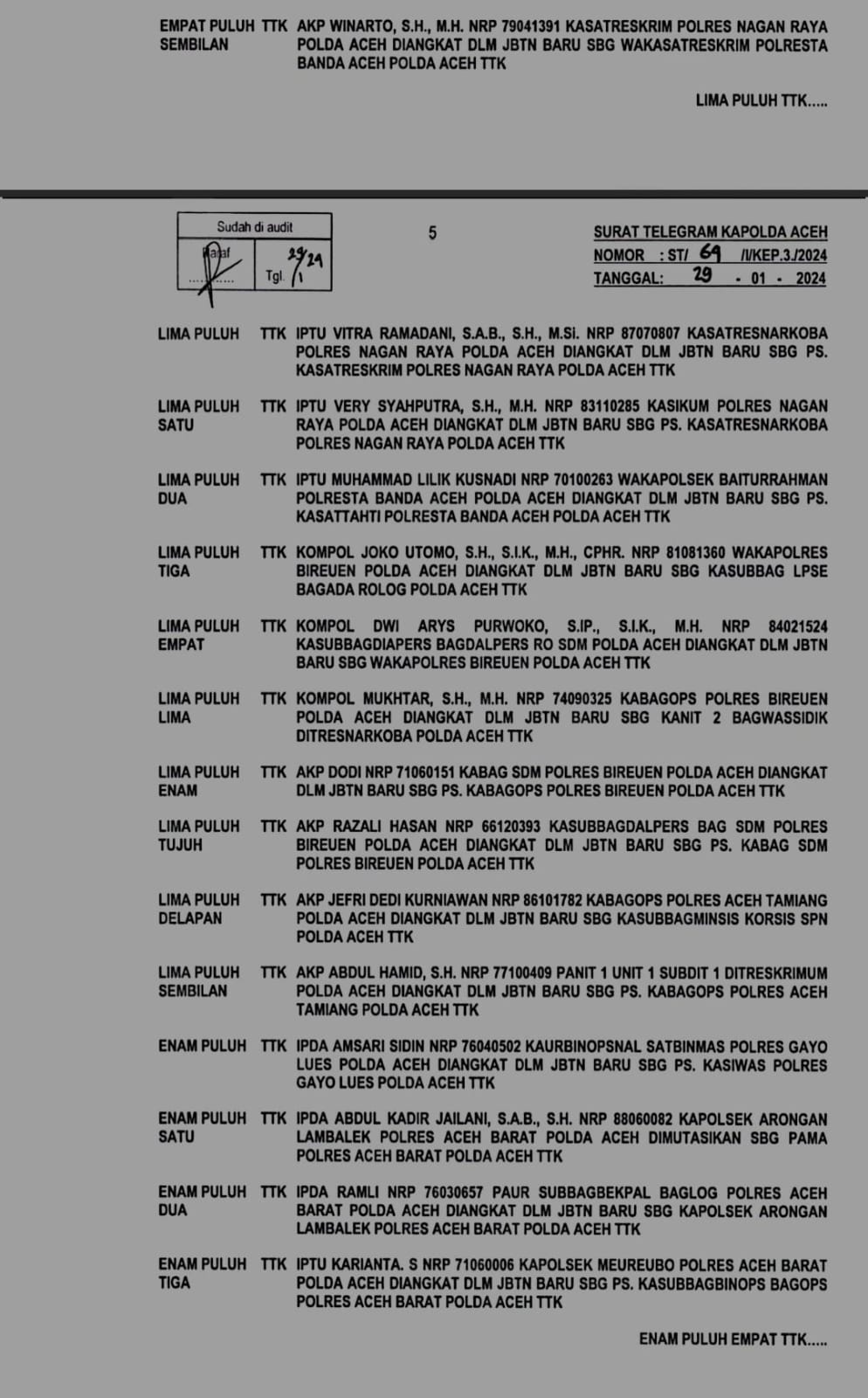 Hal tersebut diketahui bedasarkan referensi yang diperoleh dari Surat Telegram Kapolda Aceh Nomor : KEP/25/I/2024 tanggal 29 Januari 2024, mengatur tentang pemberhentian dan pengangkatan jabatan Polri di lingkungan Polda Aceh.