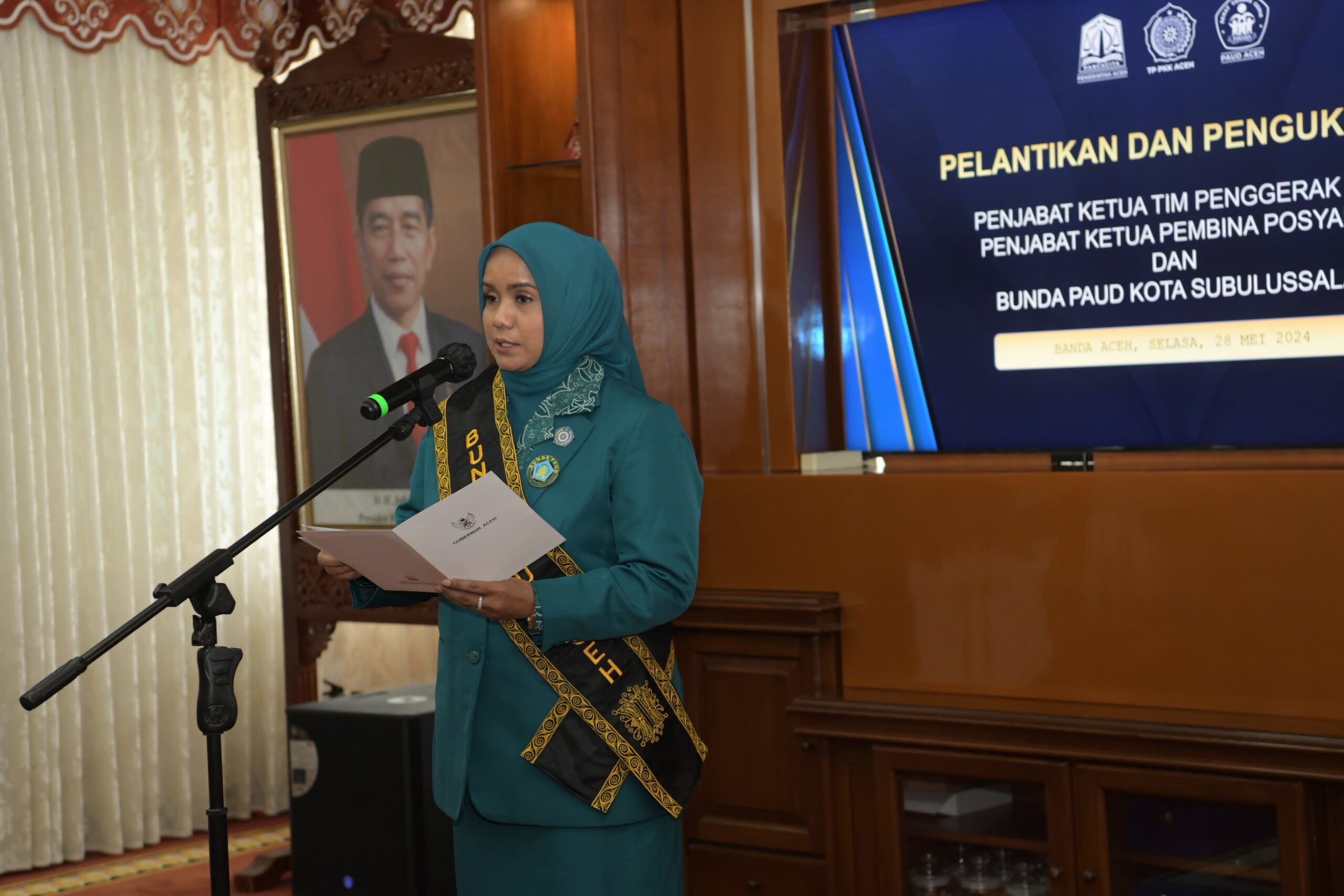 Banda Aceh – Penjabat Ketua Tim Penggerak PKK Aceh Mellani Subarni melantik dan mengukuhkan Siti Nahziah sebagai Penjabat Ketua Tim Penggerak PKK/ Pj Ketua Pembina Posyandu dan Bunda PAUD Kota Subulussalam, Selasa 28 Mei 2024.