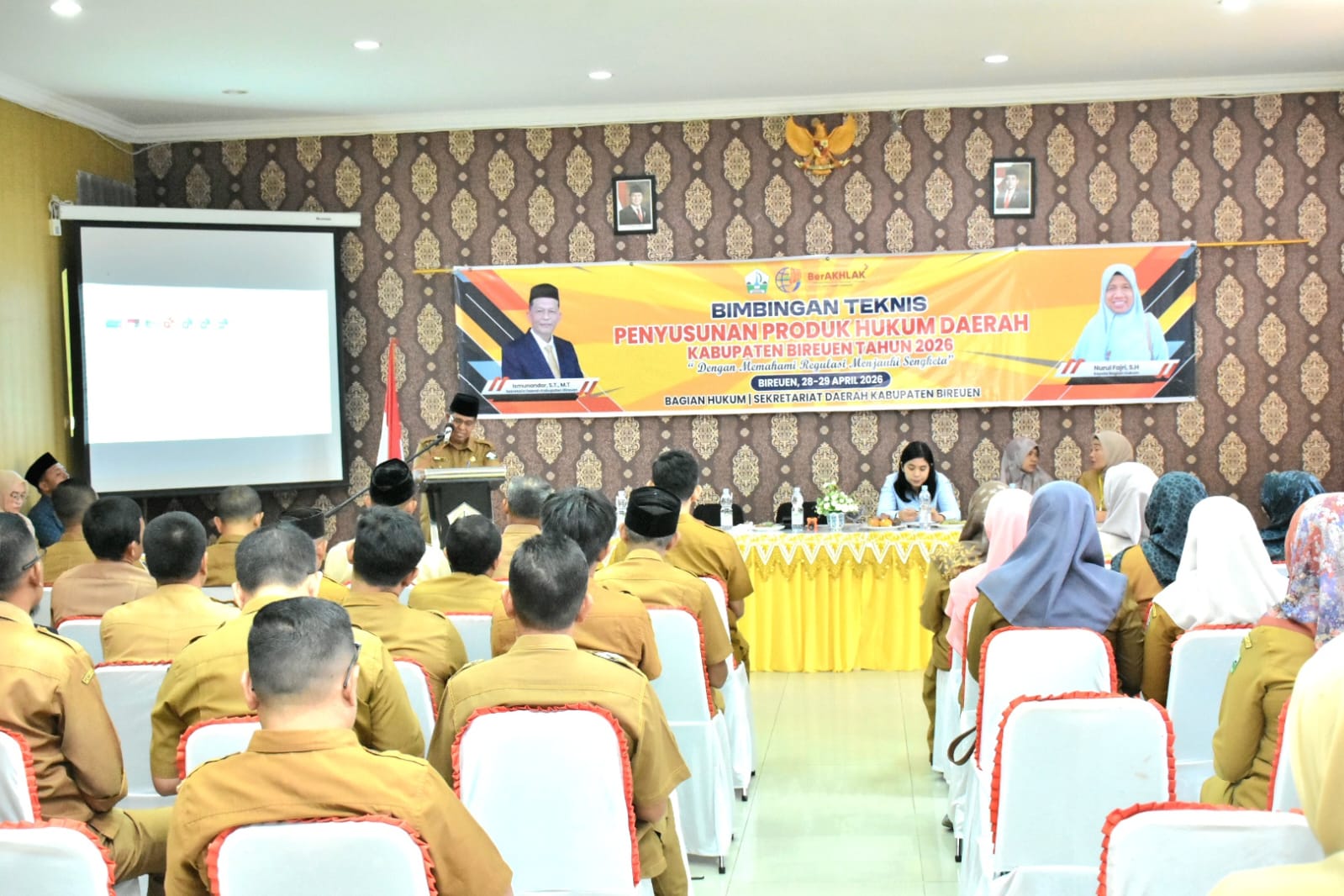 Kegiatan ini secara resmi dibuka oleh Sekretaris Daerah Kabupaten Bireuen yang diwakili oleh Asisten Pemerintahan, Keistimewaan Aceh dan Kesejahteraan Rakyat, Mulyadi, S.H., M.M. Dalam sambutannya, ia menegaskan bahwa produk hukum daerah memiliki peran strategis sebagai instrumen utama dalam menjaga stabilitas dan tata kelola pemerintahan yang baik.