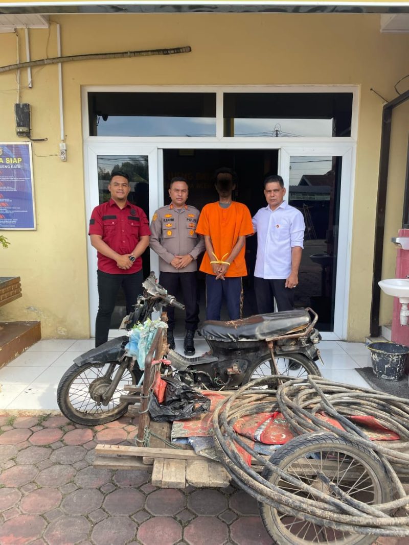 Personel Polsek Lueng Bata pun langsung ke lokasi dan melihat pelaku sedang menggulung kabel listrik dan dinaikkan ke atas sebuah becak.